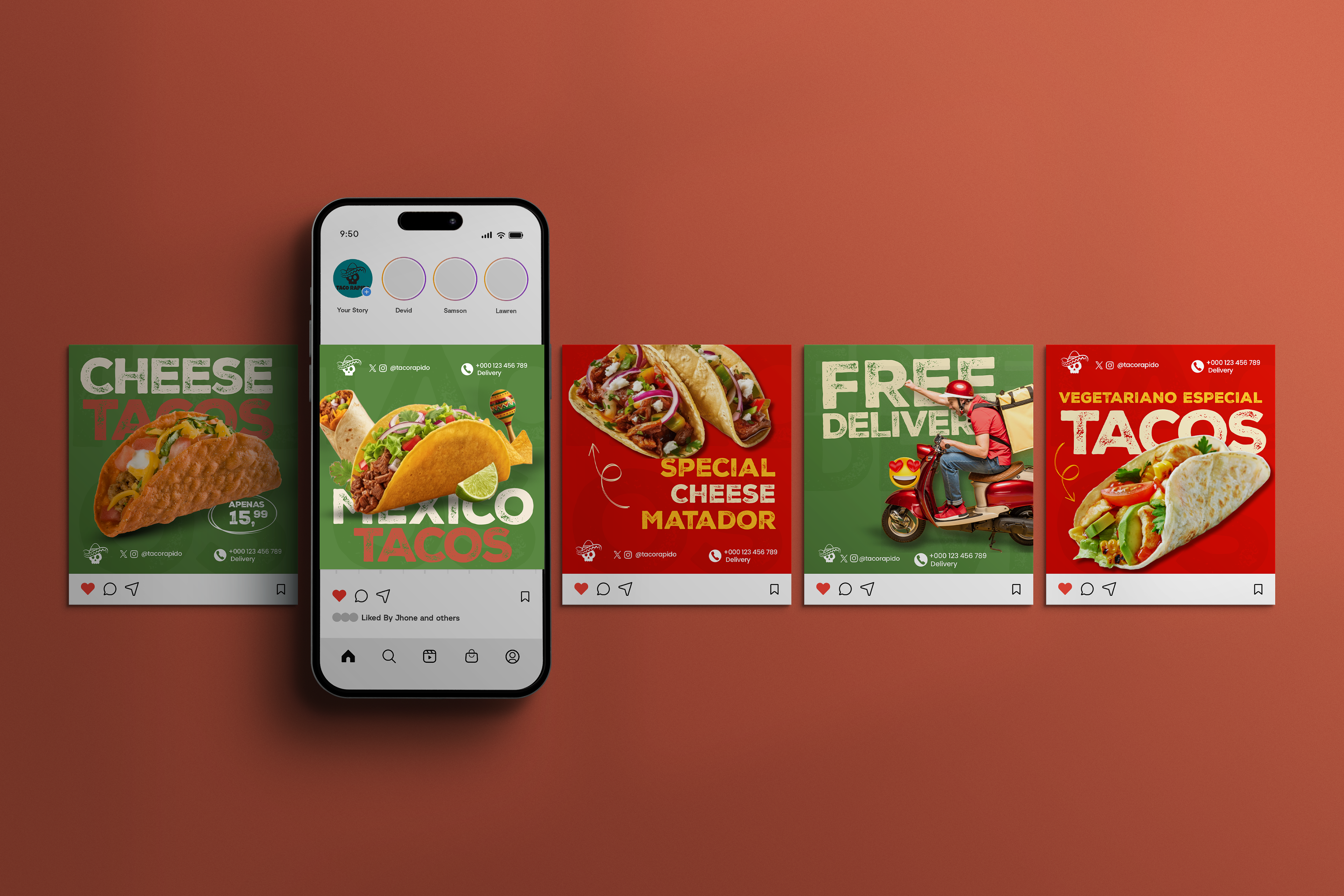 Campanha completa desenvolvida para redes sociais, destacando o cardápio e ampliando o engajamento.