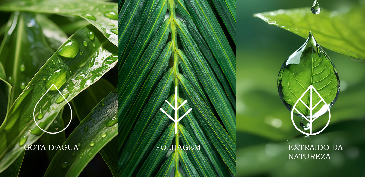 Elementos gráficos inspirados nas formas da natureza: o ciclo da água, o equilíbrio das folhas e o movimento do vento.