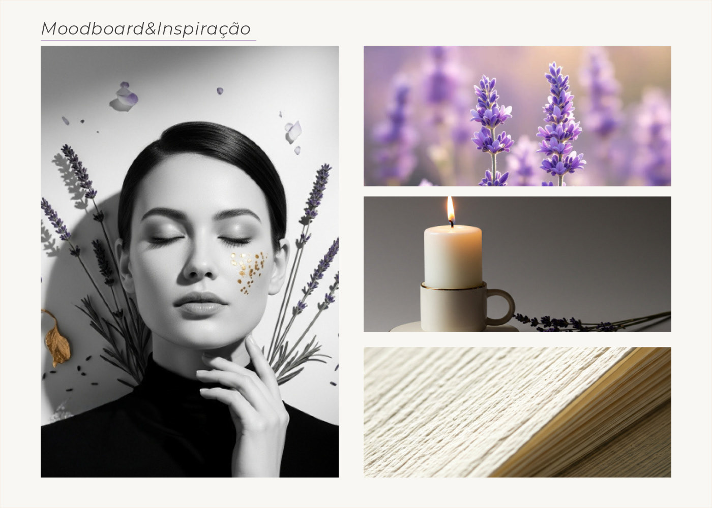 Moodboard criado para sintetizar a direção estética da marca: tons suaves, sensações de calma e presença, texturas naturais e imagens que evocam bem-estar e equilíbrio.