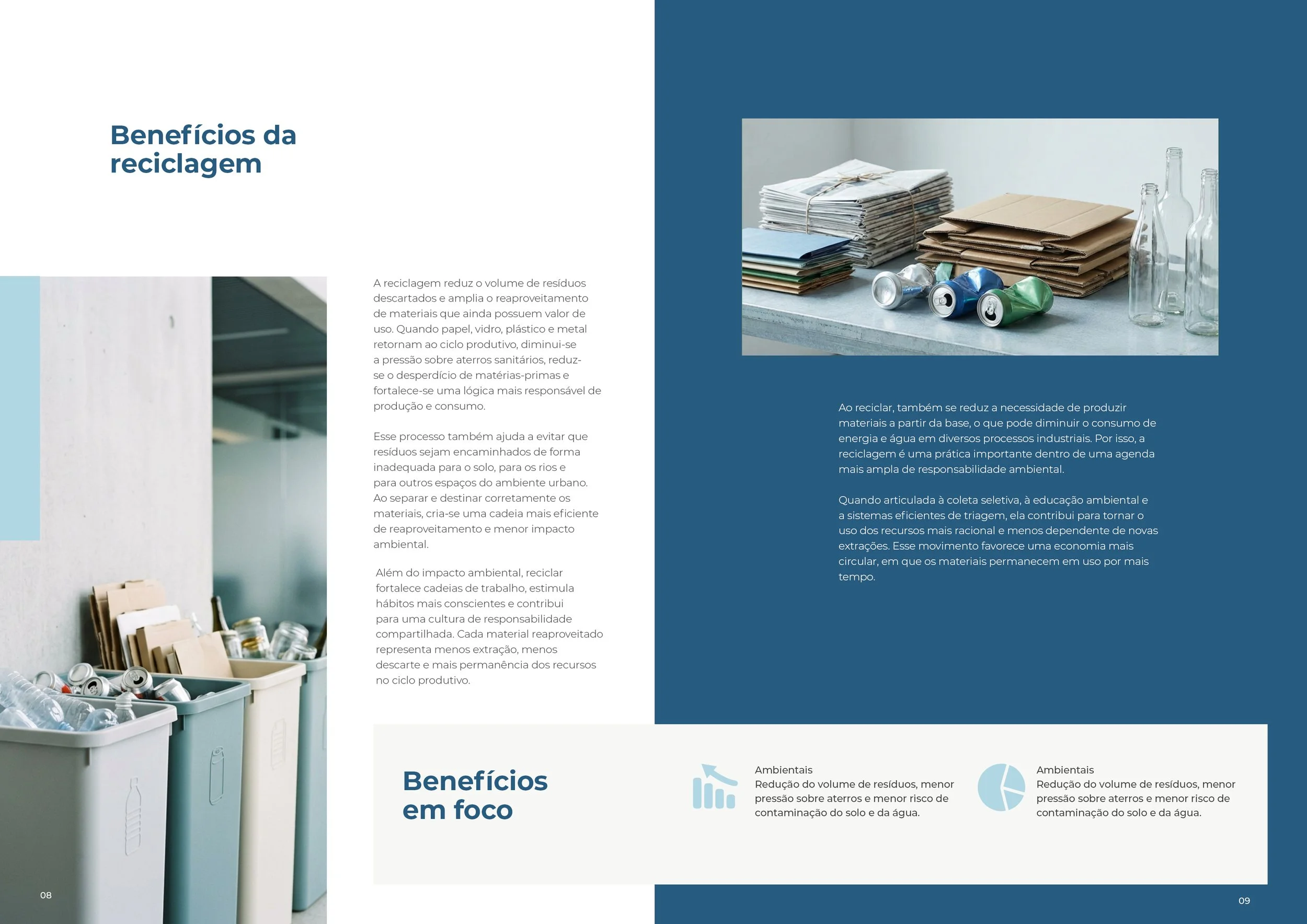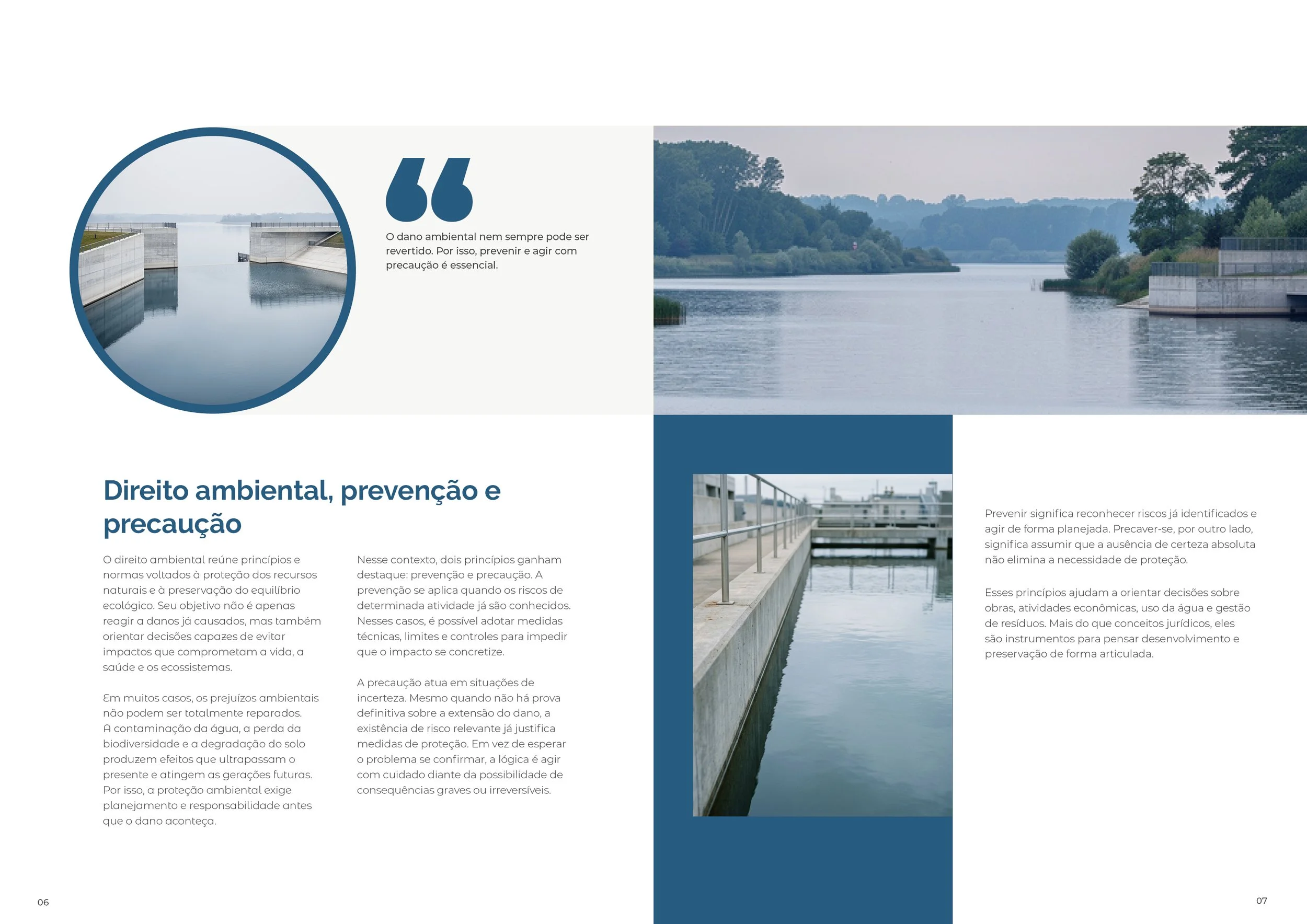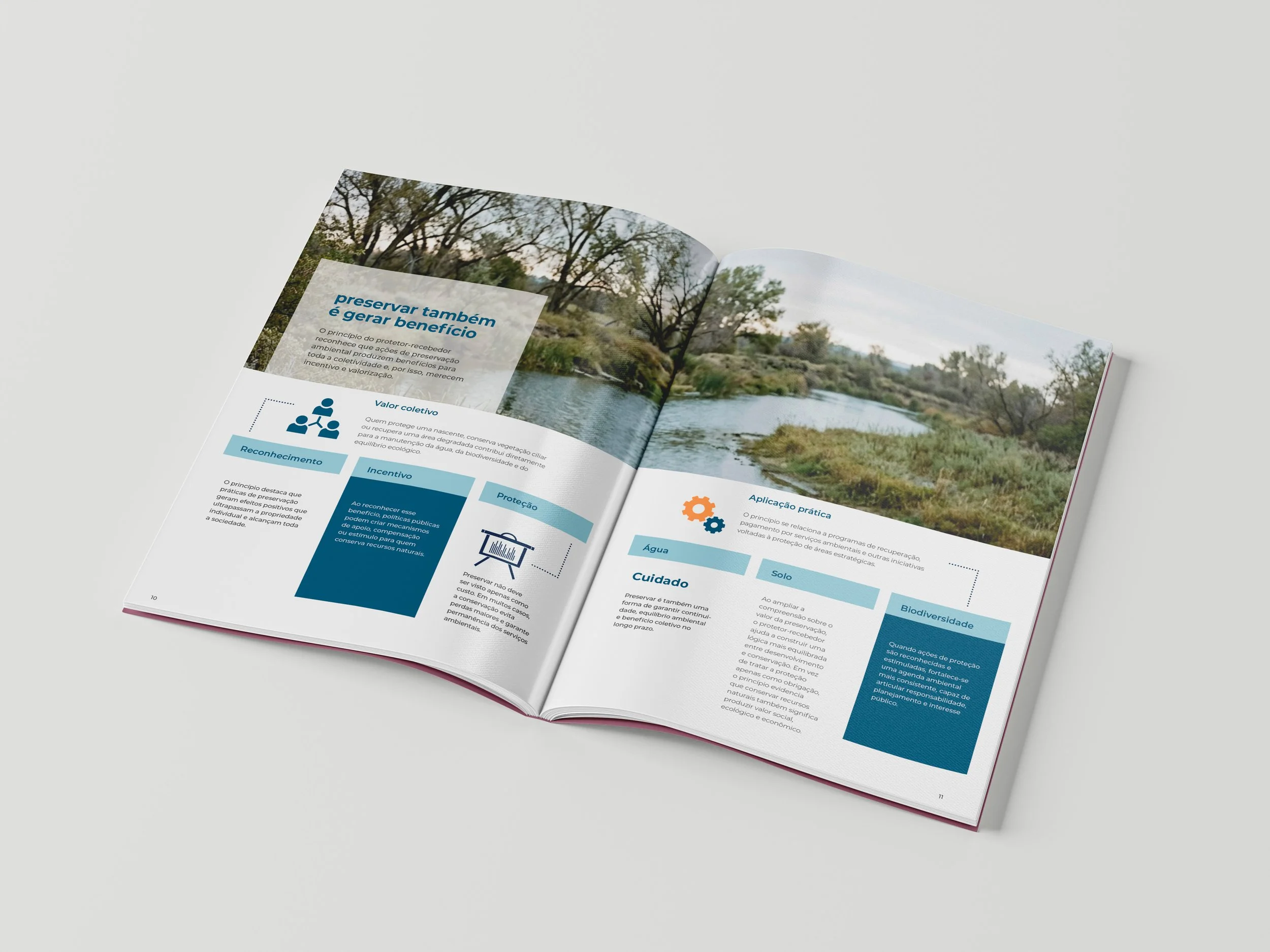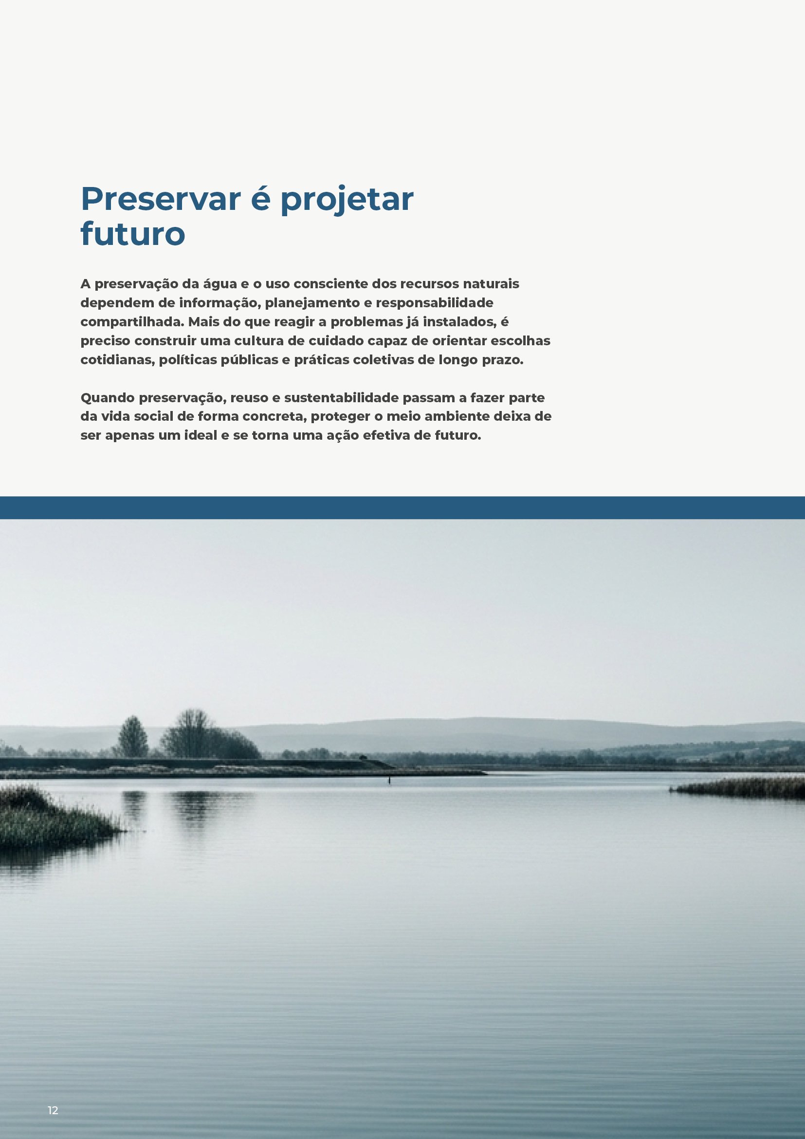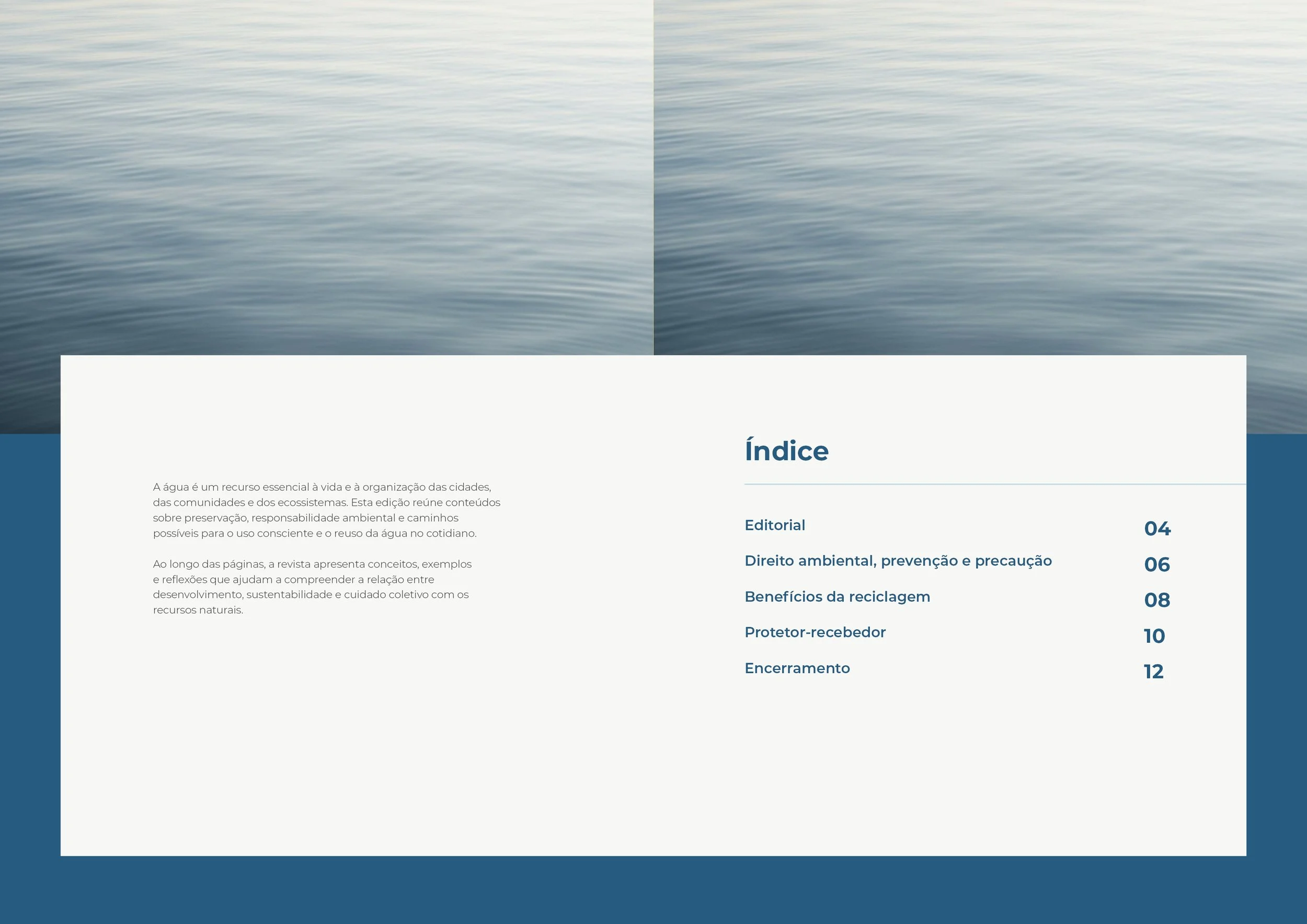 Projeto de diagramação editorial desenvolvido para apresentar, com clareza e maturidade visual, conteúdos sobre sustentabilidade, preservação e uso consciente da água. O foco foi construir hierarquia tipográfica, ritmo entre texto e imagem e uma linguagem gráfica de perfil institucional.