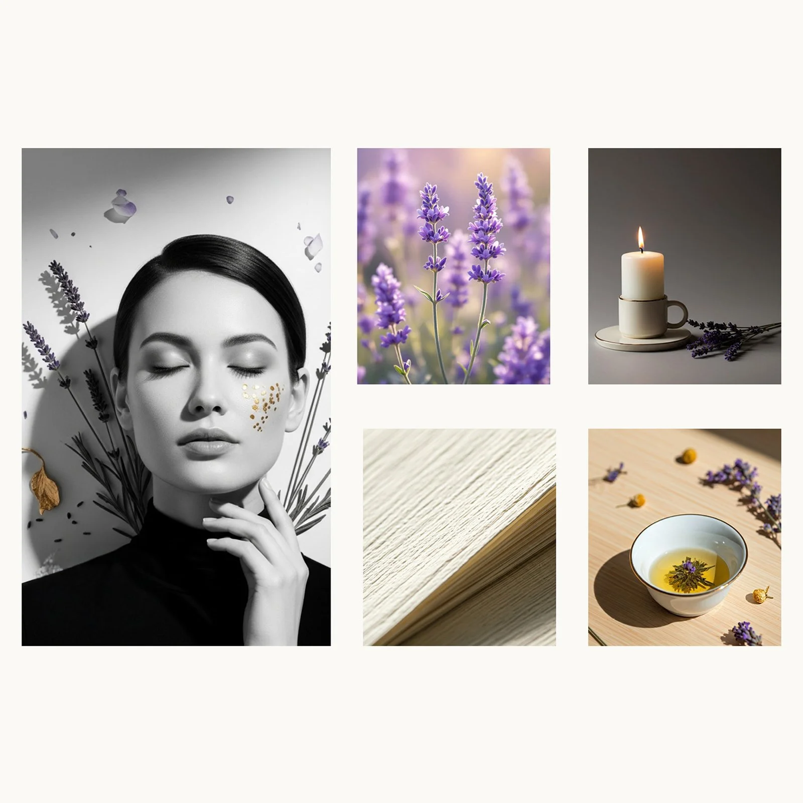 A paleta combina tons suaves e naturais que reforçam a sensação de calma e cuidado.